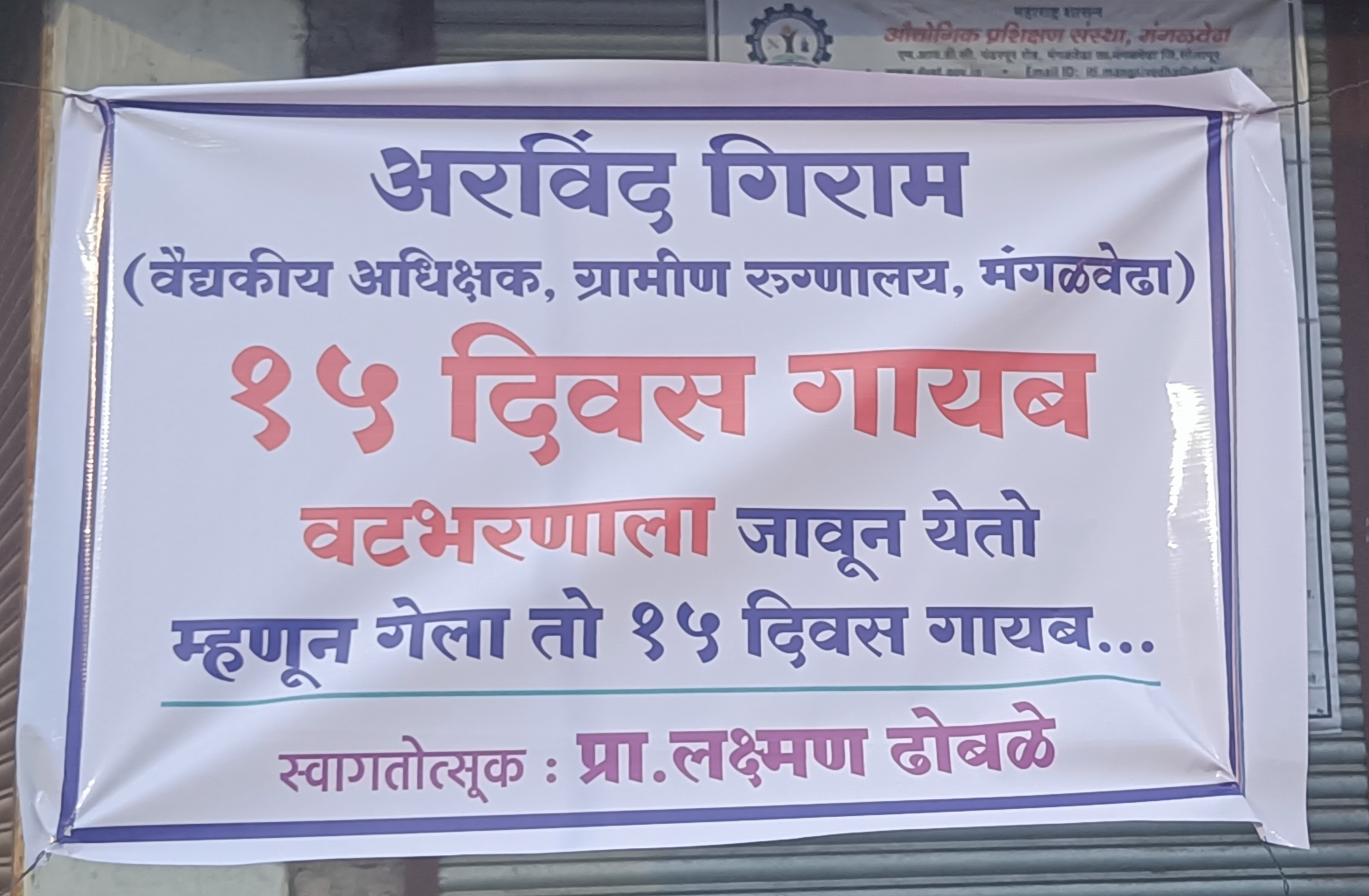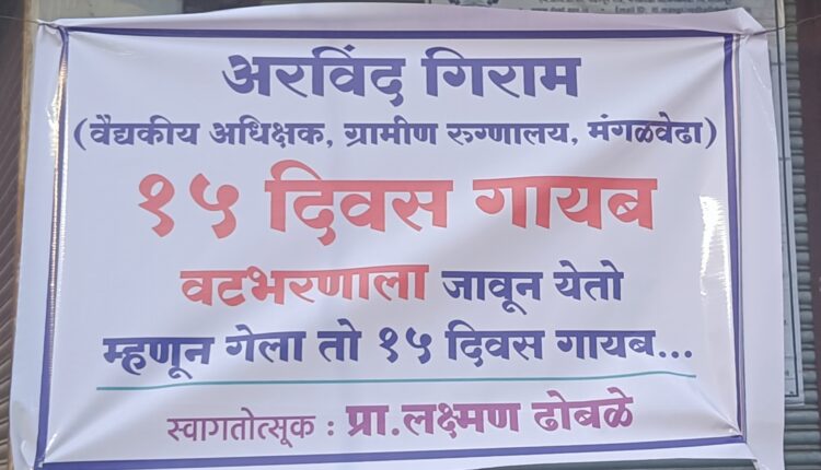 मंगळवेढा येथील ग्रामीण रुग्णालयातील वैद्यकीय अधीक्षक म्हणून कार्यरत असणारे अरविंद गिराम यांच्या रुग्णालयातील अनुपस्थिती व रुग्णालयाच्या सोईसुविधा, अस्वछता याबाबत माजी पालकमंत्री प्रा लक्ष्मणराव ढोबळे यांनी कार्यकर्त्या समोर गिराम यांची चांगलीच खरडपट्टी केली व महिनाभरात कारभारात सुधारणा न केल्यास महिलांकडून चोप देवू असा इशारा देखील दिला त्यांनी एवढ्यावरच न थांबता भर चौकात एक अरविंद गिराम पंधरा दिवसापासून गायब, वट भरणासाठी जाऊन येतो म्हणून गेला तो पंधरा दिवस गायब…. स्वागतोत्सुक लक्ष्मण ढोबळे अशा प्रकारचे डिजिटल लावून ग्रामीण रुग्णालयातील त्या वैद्यकीय अधीक्षकाच्या कारभाराच्या अब्रूची लक्तरे वेशीवर टांगली असून त्या डिजिटल ची चर्चा मात्र सर्वत्र होत आहे.