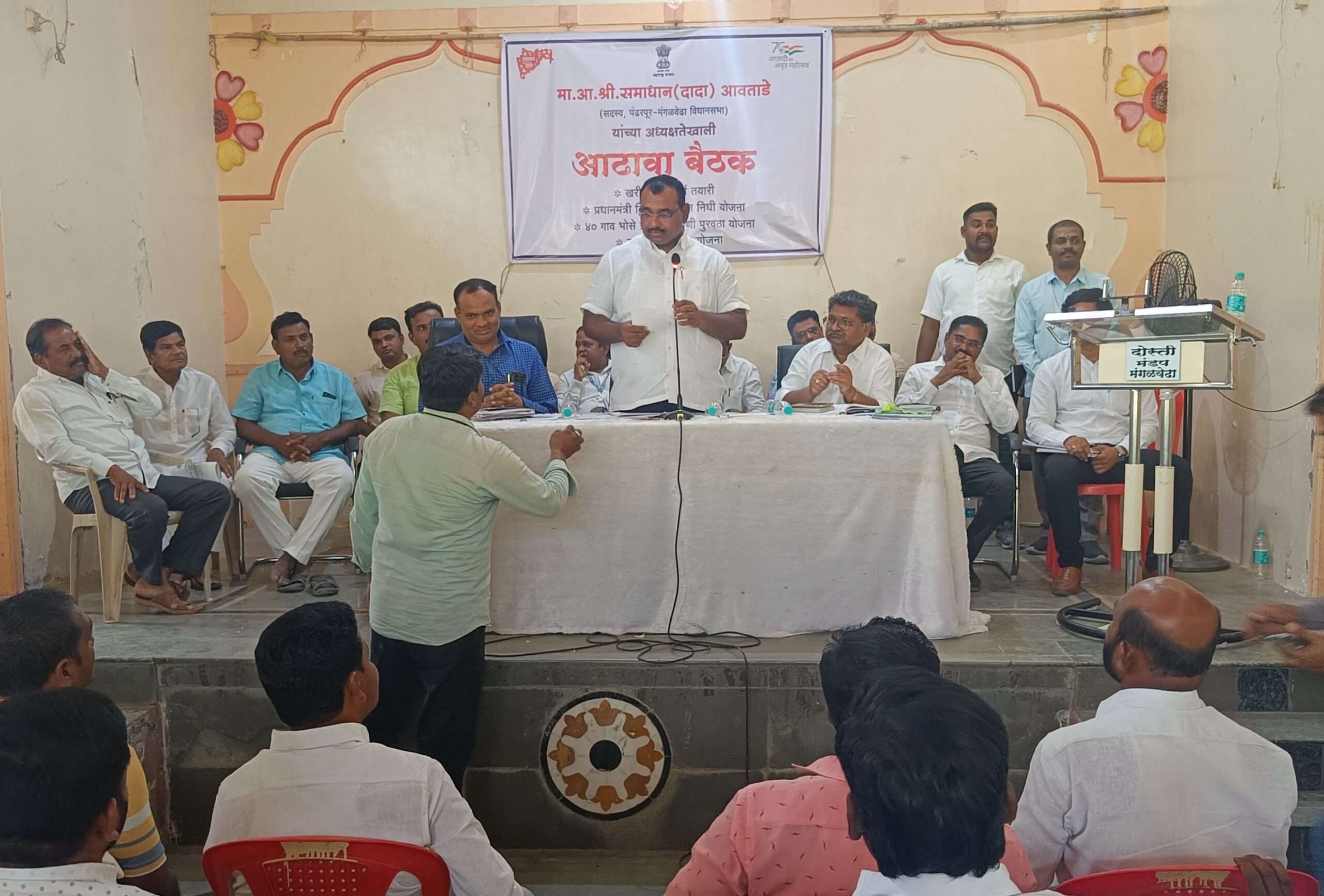 62कामे मंजूर असून त्या कामासाठी 46.65कोटी निधी मिळाला आहे. 5 कामांची वर्क ऑर्डर येणे बाकी असून 11 कामे विविध अडचणीमुळे प्रलंबित आहे य 45कामे सुरू असून 6.95कोटी खर्च झालाआहे. त्यावेळी उपस्थित पदाधिकाऱ्यांनी जलजीवनची कामे अत्यंत निकृष्ट पद्धतीने होत असून ही कामे मॅनेज करून ठराविक ठेकेदारांना दिल्याचा आरोप यावेळी उपअभियंता पांडव यांच्यावर करण्यात आला. दोनज येथील पदाधिकारी व दामाजी संचालक अशोक केदार यांनी डोनज येथील काम निकृष्ट झाल्याचे सांगत पांडव यांच्यावर निलंबनाची कारवाई करण्याची मागणी केली यावेळी आमदार अवताडे यांनी मध्यस्थी करत या कामाची त्रयस्थ यंत्रनेकडून चौकशी करणार असल्याचे सांगितले. उप अभियंता पांडव हे निकृष्ट कामाकडे लक्ष न देता ठेकेदाराची बाजू घेऊन पदाधिकाऱ्यावर गुन्हे दाखल करण्याची भाषा करत असल्याचा आरोप देखील यावेळी अनेक पदाधिकाऱ्यांनी केला. यावेळी आमदार समाधान आवताडे यांनी पांडव यांना जलजीवन च्या कामाबाबत नागरिकांच्या तक्रारीची दखल घेत कामे गुणवत्ता पूर्ण करा अन्यथा चौकशीला सामोरे जावे लागेल असे सांगितले तसेच पदाधिकाऱ्यांवर गुन्हे दाखल करण्याची भाषा योग्य नाही. ठराविक ठेकेदाराला काम देण्यासाठी टेंडर मॅनेज केले का असा प्रश्न उपस्थित केला. तालुक्यातील जलजीवन च्या निकृष्ट कामाबाबत नागरिकांच्या वाढत्या तक्रारी लक्षात घेता कामे चांगल्या पद्धतीने करा ग्रामीण भागातील लोकांच्या पिण्याच्या सोयीसाठी सरकारने निधी दिला असून त्या निधीचा योग्य सदुपयोग व्हावा यासाठी तुमची यंत्रणा कामाला लावा कामात सुधारणा करून पदाधिकारी प्रशासन समन्वय ठेवा, डोनज येथील कामाची चौकशी करून तथ्य आढळल्यास तालुक्यातील सर्वच कामांची चौकशी केली जाईल असेही त्यांनी यावेळी सांगितले. आज झालेल्या आढावा बैठकीत प्रामुख्याने पी एम किसान पेन्शन योजना जलजीवन च्या विविध कामासंदर्भात अधिकाऱ्यांना नागरिकांनी व पदाधिकाऱ्यांनी चांगले धारेवर धरले.